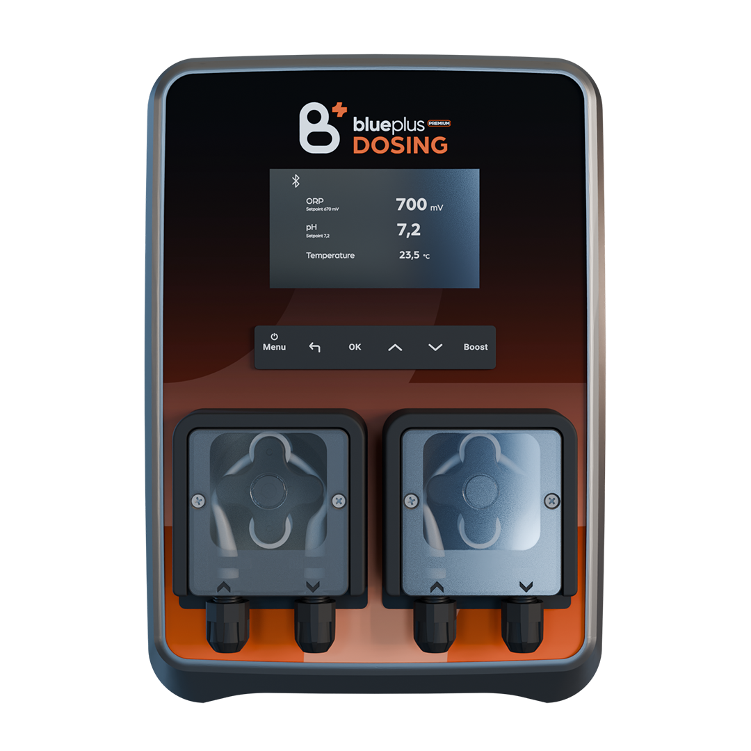 Blueplus dosing premium tilbyder den samme pålidelige automatiske klor- og pH-regulering som blueplus dosing, men i en mere avanceret udgave. Systemet kombinerer præcise ORP- og pH-målinger med stille integrerede doseringspumper for stabil og effektiv vandbehandling. Det ekstra store display viser doseringer og måleværdier i realtid, så brugeren altid har et klart overblik. Det moderne og robuste design giver samtidig en professionel og stilfuld fremtoning.