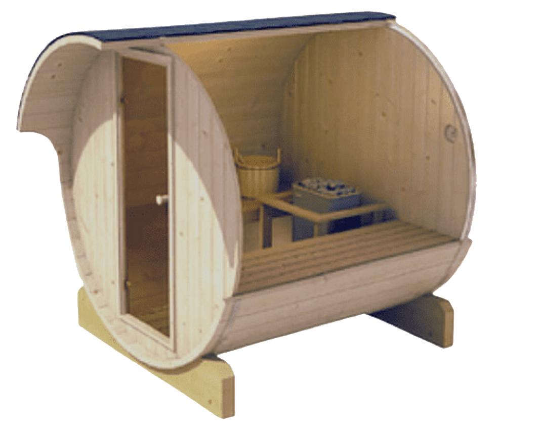 The round shape of this barrel sauna promotes fast and even heat circulation without corner heat loss. Built from European thermowood and finished with bitumen shingles and rain slats, this model is weather-resistant and low-maintenance — ready for any wellness installation.